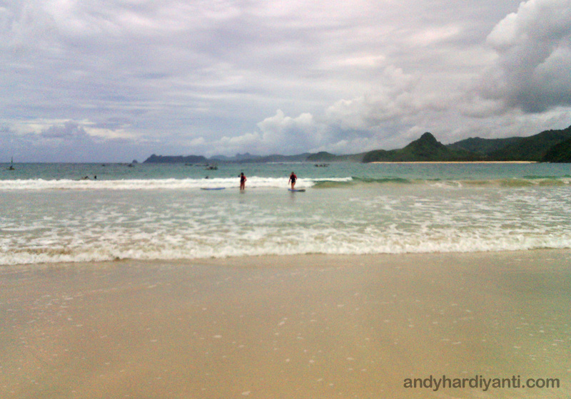 Bersih, cantik, ombak yang tenang, garis pantai yang panjangnya mencapai sekitar 1 kilometer, pasirnya yang putih, suasananya yang tenang dan apalagi ya yang menjadikan si pantai yang berjarak 48 kilometer dari kota Mataram ini menang banyak? Ah ya! Warna lautnya cantik, coba lihat itu gradasinya? Seandainya tidak mendung, maka langit dan laut pun terlihat seperti permainan warna, saya membayangkan sedang melihat kelompok warna biru yang berjejer dari kotak crayon milik Sedja π Belum lagi bagian pasirnya yang saat disapu air akan serupa mengkilapnya kaca. Kalau sudah begini saya jadi ingat pada Pantai Bira yang ada di Sulawesi Selatan sana. Sebelum tiba pada Selong Belanak, saya pikir tidak dapat menemukan yang seperti Pantai Bira itu di Lombok.