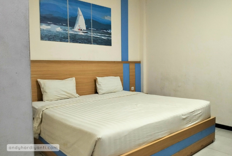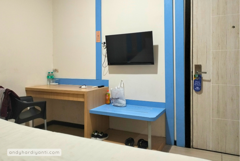 Kami menginap di kamar tipe Superior Double tanpa jendela, rate 200ribu-an per malam. Dengan ukuran 16 m², kamar tersebut terbilang cukup untuk sekadar tempat beristirahat semalam bagi seorang ibu dan anaknya. Di dalamnya terdapat satu tempat tidur queen size, set meja dan kursi, televisi, AC, tempat barang (apa sih namanya?), dua botol air mineral, lemari (lengkap dengan hanger), cermin, dan kamar mandi (shower, closet, dan wastafel).